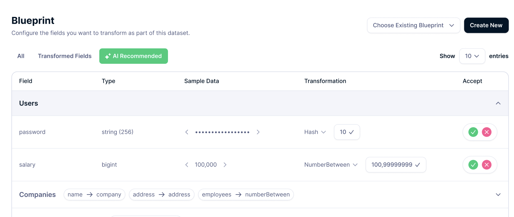 Configure a blueprint to apply data anonymization automatically. Or let our platform configure it for you. Whenever we refresh your dev database from a new snapshot, we automatically apply data anonymization and transformation in order to eliminate the risk of exposing sensitive information.